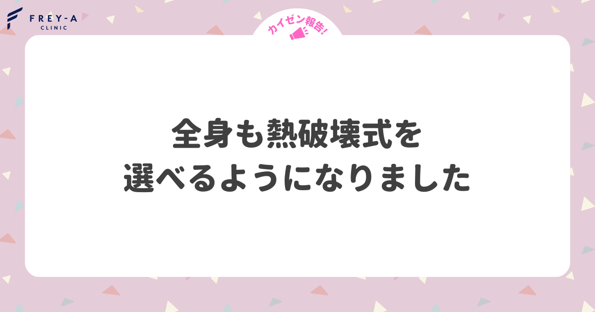 昨年2023年7月から、脇・VIO脱毛においては、蓄熱式と熱破壊式の両方から選択いただけるサービスを提供してまいりました。患者様からのご好評を受け、さらなる脱毛ニーズへの対応を目指し、熱破壊式の対応範囲を全身に拡大いたしました。